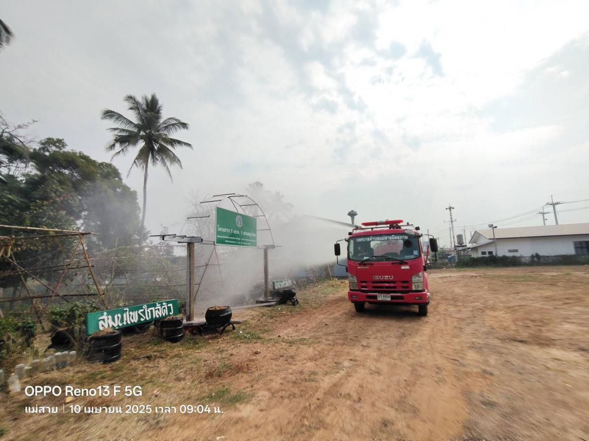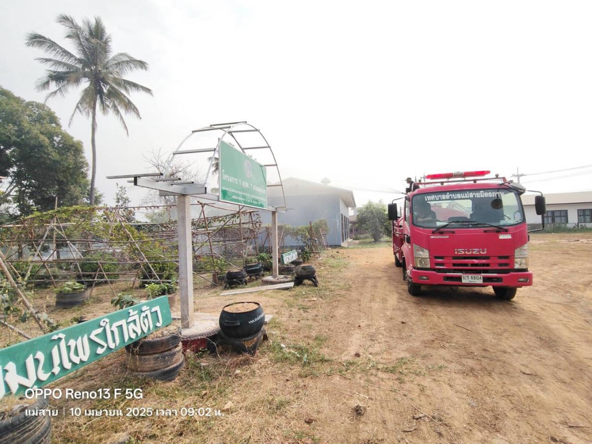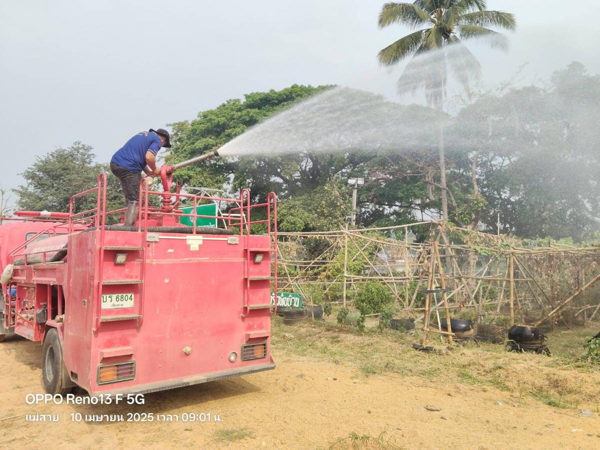 วันพฤหัสบดีที่ 10 เมษายน 2568 เวลา 08.30 น. ร้อยโทกิตติชัย เจริญยิ่ง ปลัดเทศบาล ปฏิบัติหน้าที่นายกเทศมนตรีตำบลแม่สายมิตรภาพ มอบหมายให้เจ้าหน้าที่งานป้องกันและบรรเทาสาธารณภัย ฝ่ายปกครอง สำนักปลัดเทศบาล นำรถบรรทุกน้ำออกฉีดพ่นละอองน้ำ และรดน้ำต้นไม้บริเวณพื้นที่โครงการ 1 อปท. 1 สวนสมุนไพร และฉีดพ่นล้างทำความสะอาดบริเวณวัดสันมะนะ เพื่อเพิ่มความชื้นในอากาศ แก้ไขปัญหาหมอกควัน และฝุ่นละอองขนาดเล็ก (PM 2.5)
