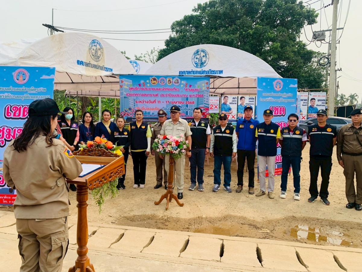ร้อยโทกิตติชัย เจริญยิ่ง ปลัดเทศบาล ปฏิบัติหน้าที่นายกเทศมนตรีตำบลแม่สายมิตรภาพ เป็นประธานเปิดจุดบริการประชาชนและนักท่องเที่ยว "ด่านชุมชน" ช่วงเทศกาลสงกรานต์ ประจำปีงบประมาณ พ.ศ. 2568 ระหว่างวันที่ 11 - 17 เมษายน 2568 ภายใต้หัวข้อในการรณรงค์ "ขับขี่ปลอดภัย เมืองไทยไร้อุบัติเหตุ" ณ บริเวณวงเวียนด่านศุลกากรแห่งที่ 2 โดยมี ร.ต.ท.เพชร ใจเสาร์ รอง สว.ป. สภ.เม่สาย นางอมรรัตน์ เงินทอง ผอ.รพ.สต.แม่สาย หัวหน้าส่วนราชการ พนักงานเจ้าหน้าที่เทศบาลตำบลแม่สายมิตรภาพ ผู้ใหญ่บ้านหมู่ 13 ผู้ใหญ่บ้านหมู่ 9 ผู้ใหญ่บ้านหมู่ 11 ผู้ใหญ่บ้านหมู่ 5 และอปพร. ร่วมพิธีเปิดจุดบริการดังกล่าว