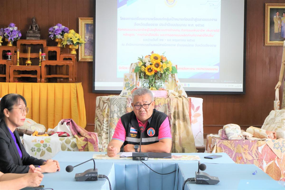 ร้อยโทกิตติชัย เจริญยิ่ง ปลัดเทศบาล ปฏิบัติหน้าที่นายกเทศมนตรีตำบลแม่สายมิตรภาพ เป็นประธานพิธีโครงการเตรียมความพร้อมแก่กลุ่มเป้าหมายก่อนเข้าสู่ตลาดแรงงาน จังหวัดเชียงราย ประจำปีงบประมาณ พ.ศ. 2568 กิจกรรมแนะแนวอาชีพผู้ไม้อยู่ในระบบการจ้างงาน กิจกรรมเพิ่มอาชีพ เพิ่มรายได้ หลักสูตร "การทำผ้าอีโค่ปริ้น และการออกแบบผลิตภัณฑ์จากผ้าอีโค่ปริ้น" จัดโดยสำนักจัดหางานจังหวัดเชียงราย กรมการจัดหางาน กระทรวงแรงงาน ระหว่างวันที่ 22 - 23 พฤษภาคม 2568 ณ ห้องประชุมสภาเทศบาลตำบลแม่สายมิตรภาพ ชั้น 3 สำนักงานเทศบาลตำบลแม่สายมิตรภาพ