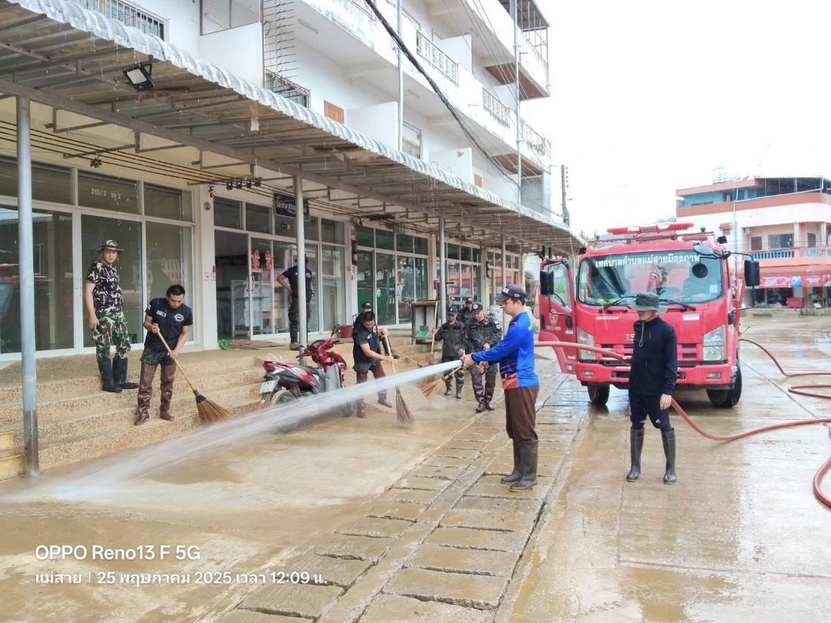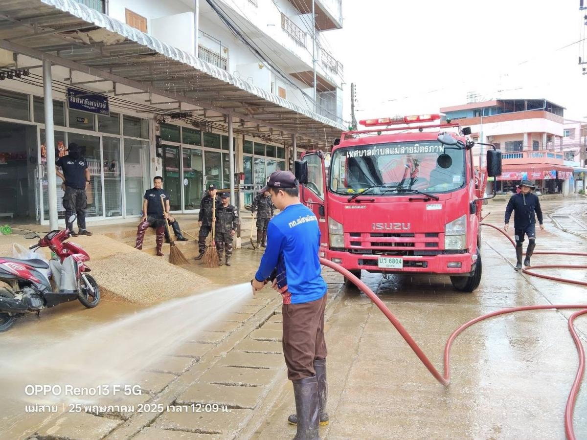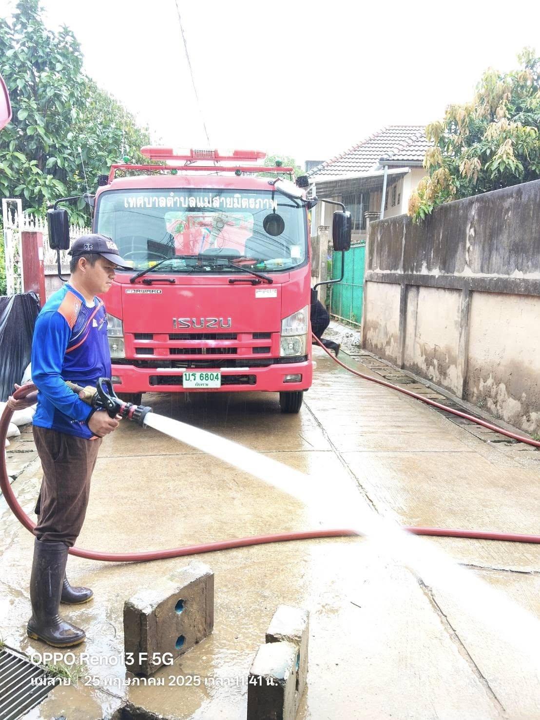 เทศบาลตำบลแม่สายมิตรภาพ มอบหมาย เจ้าหน้าที่งานป้องกันและบรรเทาสาธารณภัย จำนวน 3 คน พร้อมรถน้ำช่วยดับเพลิง จำนวน 1 คัน สนับสนุนภารกิจล้างดินโคลน พื้นที่ #บ้านเหมืองแดง หมู่ที่ 2 ต.แม่สาย ตามที่ได้รับมอบภารกิจจากที่ประชุม ศูนย์บัญชาการเหตุการณ์อุทกภัย อ.แม่สาย ในการประชุมเมื่อเย็นวันที่ 24 พฤษภาคม 2568