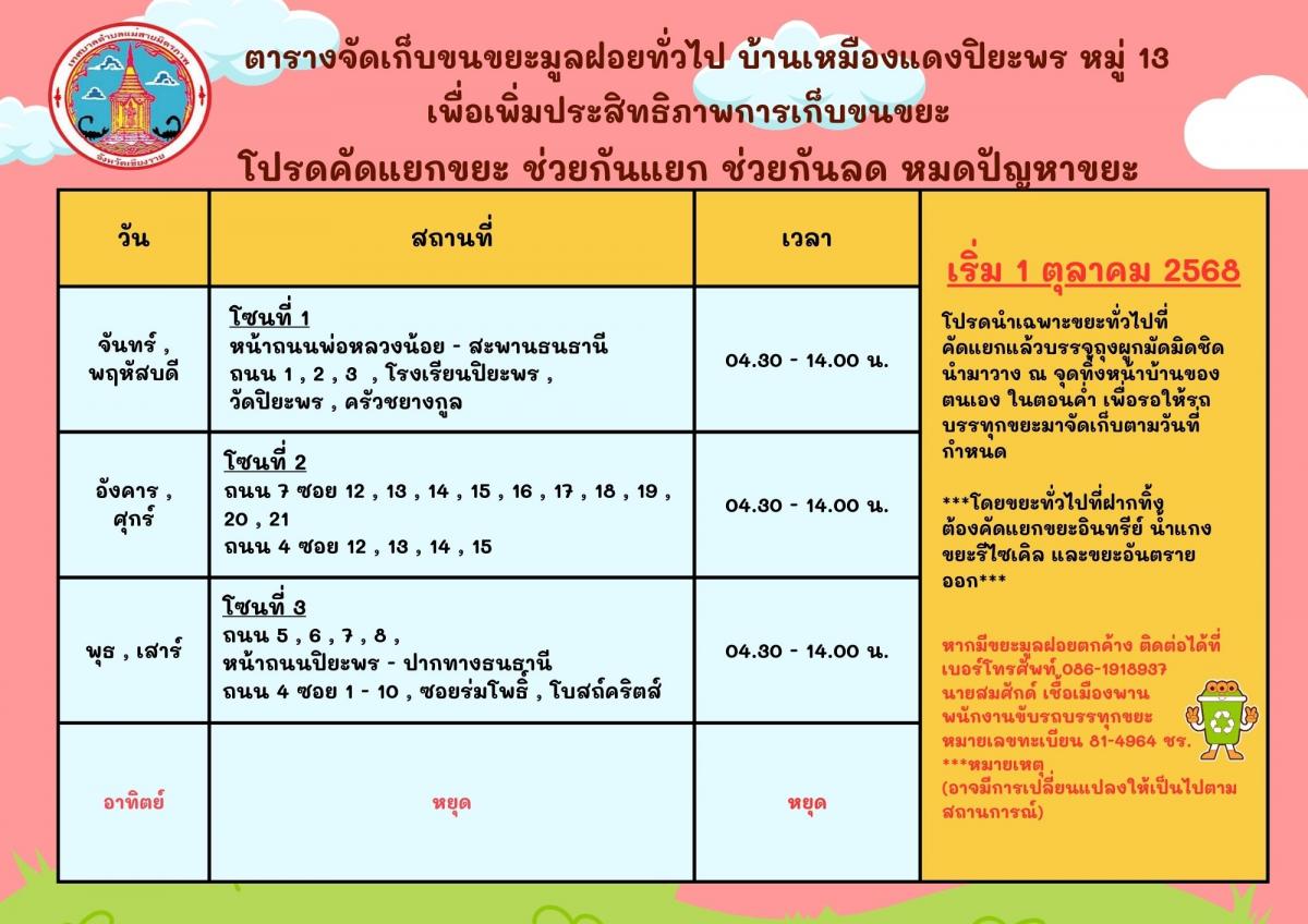 ประชาสัมพันธ์ตารางจัดเก็บขยะมูลฝอยทั่วไป บ้านเหมืองแดงปิยะพร หมู่ 13 เริ่ม 1 ตุลาคม 2568