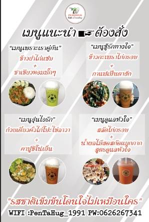 อีกหนึ่งร้านน่ารักๆ บรรยากาศจัดว่าเด็ดมากๆเลยขอรับ ทั้งด้านอาหาร เครื่องดื่ม เเละการบริการ อยากให้ทุกท่านไปอุดหนุนเเละลองไปสัมผัสรสชาติอาหารเเสนอร่อยได้ครับ ที่ร้านเป็นตาฮัก คาเฟ่ / Pen-Ta-Hug มีเมนูมากมายไว้คอยบริการลูกค้าทุกท่านครับ