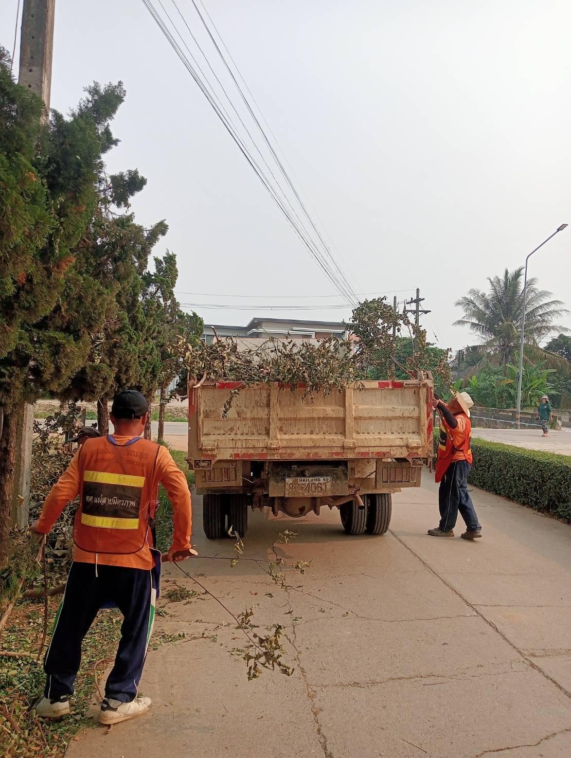 เวลา 08.59 น.ตัดแต่งกิ่งไม้บดบังทัศนียภาพเส้นทางสัญจร บริเวณถนนเลียบคลองชลประทาน บ้านสันทราย หมู่ที่ 9 สำนักงานเทศบาลฯ