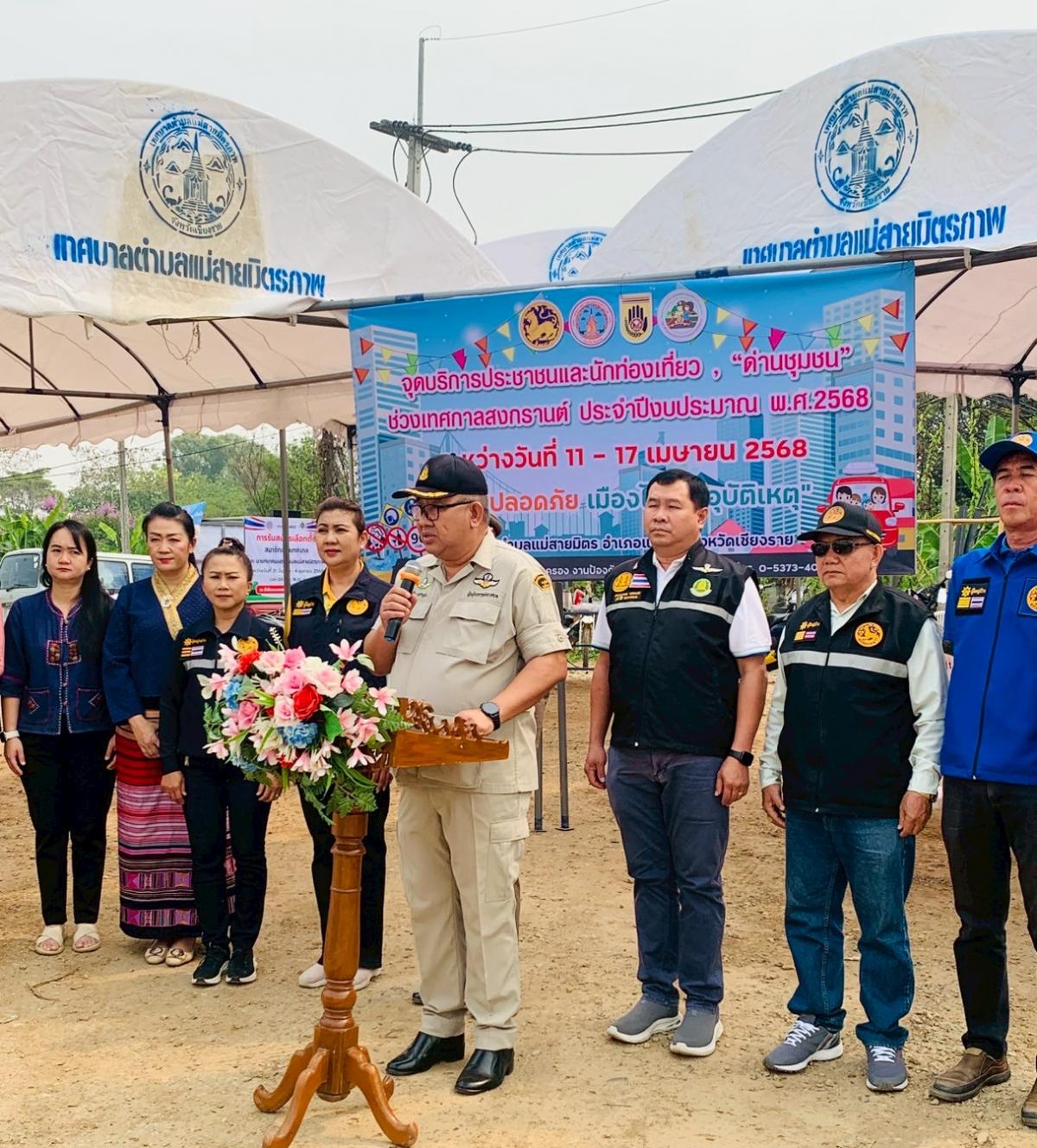 ร้อยโทกิตติชัย เจริญยิ่ง ปลัดเทศบาล ปฏิบัติหน้าที่นายกเทศมนตรีตำบลแม่สายมิตรภาพ เป็นประธานเปิดจุดบริการประชาชนและนักท่องเที่ยว "ด่านชุมชน" ช่วงเทศกาลสงกรานต์ ประจำปีงบประมาณ พ.ศ. 2568 ระหว่างวันที่ 11 - 17 เมษายน 2568 ภายใต้หัวข้อในการรณรงค์ "ขับขี่ปลอดภัย เมืองไทยไร้อุบัติเหตุ" ณ บริเวณวงเวียนด่านศุลกากรแห่งที่ 2 โดยมี ร.ต.ท.เพชร ใจเสาร์ รอง สว.ป. สภ.เม่สาย นางอมรรัตน์ เงินทอง ผอ.รพ.สต.แม่สาย หัวหน้าส่วนราชการ พนักงานเจ้าหน้าที่เทศบาลตำบลแม่สายมิตรภาพ ผู้ใหญ่บ้านหมู่ 13 ผู้ใหญ่บ้านหมู่ 9 ผู้ใหญ่บ้านหมู่ 11 ผู้ใหญ่บ้านหมู่ 5 และอปพร. ร่วมพิธีเปิดจุดบริการดังกล่าว