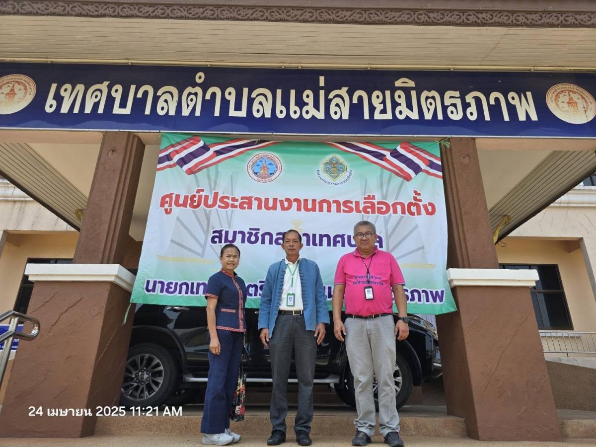 ร้อยโทกิตติชัย เจริญยิ่ง ปลัดเทศบาล ปฏิบัติหน้าที่นายกเทศมนตรีตำบลแม่สายมิตรภาพ ในฐานะผู้อำนวยการการเลือกตั้งประจำเทศบาลตำบลแม่สายมิตรภาพ พร้อมด้วยหัวหน้าส่วนราชการ และเจ้าหน้าที่เทศบาลตำบลแม่สายมิตรภาพ ให้การต้อนรับ นายทรงศักดิ์ วัลย์ใจ ผู้ตรวจการเลือกตั้งประจำจังหวัดเชียงราย ลงพื้นที่ตรวจเยี่ยมศูนย์ประสานงานการเลือกตั้งตามเทศบาลตำบลแม่สายมิตรภาพ โดยให้คำแนะนำ พร้อมแนวทางการปฏิบัติในการเลือกตั้งฯ ณ ศูนย์ประสานงานการเลือกตั้งสมาชิกสภาเทศบาลตำบลแม่สายมิตรภาพและนายกเทศมนตรีเทศบาลตำบลแม่สายมิตรภาพ