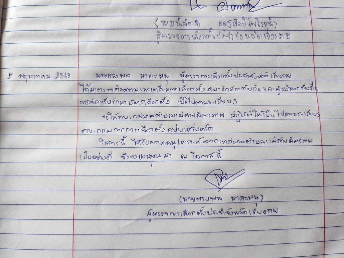 ผู้อำนวยการกองการศึกษา นางเกศินี จันทร์เลน หัวหน้าฝ่ายปกครอง และเจ้าหน้าที่เทศบาลตำบลแม่สายมิตรภาพ ให้การต้อนรับ นายทรงพล นาคะหนุ ผู้ตรวจการเลือกตั้งประจำจังหวัดเชียงราย ลงพื้นที่ตรวจเยี่ยมศูนย์ประสานงานการเลือกตั้งตามเทศบาลตำบลแม่สายมิตรภาพ โดยให้คำแนะนำ พร้อมแนวทางการปฏิบัติในการเลือกตั้งฯ ณ ศูนย์ประสานงานการเลือกตั้งสมาชิกสภาเทศบาลตำบลแม่สายมิตรภาพและนายกเทศมนตรีเทศบาลตำบลแม่สายมิตรภาพ