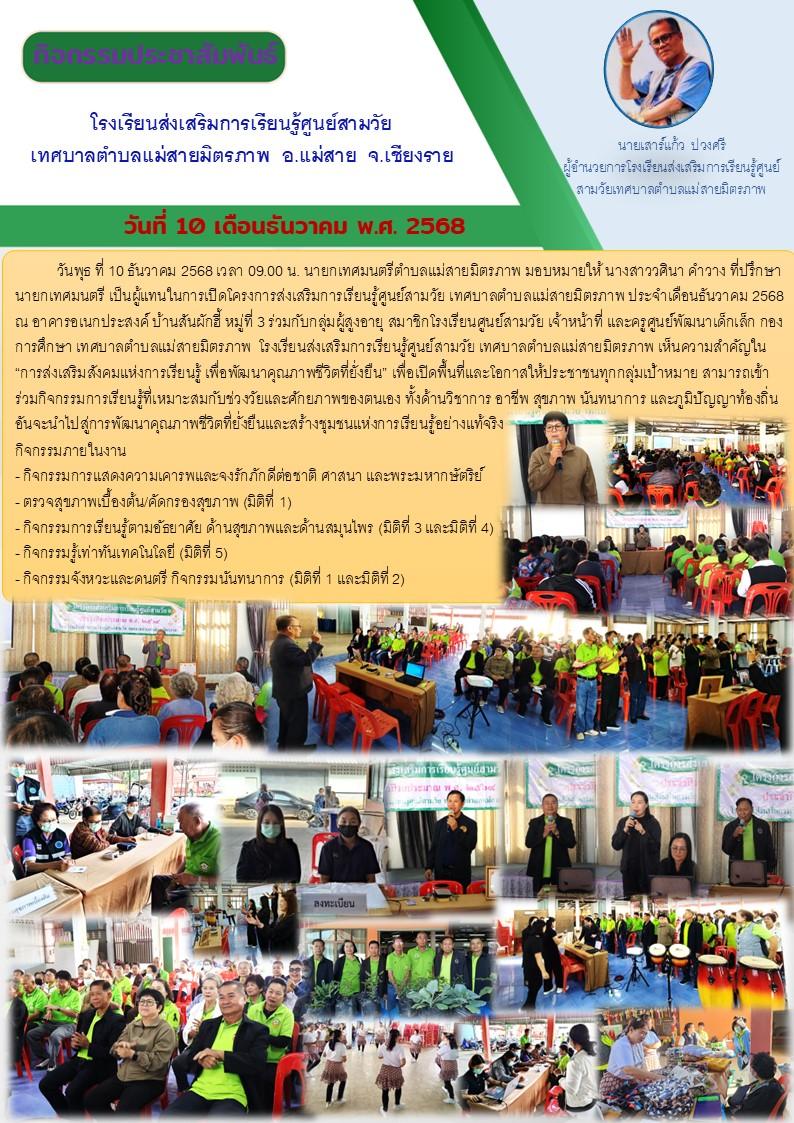 โรงเรียนส่งเสริมการเรียนรู้ศูนย์สามวัย เทศบาลตำบลแม่สายมิตรภาพ เห็นความสำคัญใน “การส่งเสริมสังคมแห่งการเรียนรู้ เพื่อพัฒนาคุณภาพชีวิตที่ยั่งยืน” เพื่อเปิดพื้นที่และโอกาสให้ประชาชนทุกกลุ่มเป้าหมาย สามารถเข้าร่วมกิจกรรมการเรียนรู้ที่เหมาะสมกับช่วงวัยและศักยภาพของตนเอง ทั้งด้านวิชาการ อาชีพ สุขภาพ นันทนาการ และภูมิปัญญาท้องถิ่น อันจะนำไปสู่การพัฒนาคุณภาพชีวิตที่ยั่งยืนและสร้างชุมชนแห่งการเรียนรู้อย่างแท้จริง