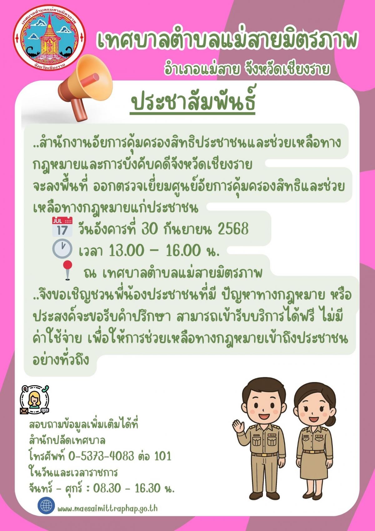 ประชาสัมพันธ์เทศบาลตำบลแม่สายมิตรภาพ เชิญชวนปรึกษาปัญหาทางกฎหมายหรือประสงค์ขอรับคำปรึกษา